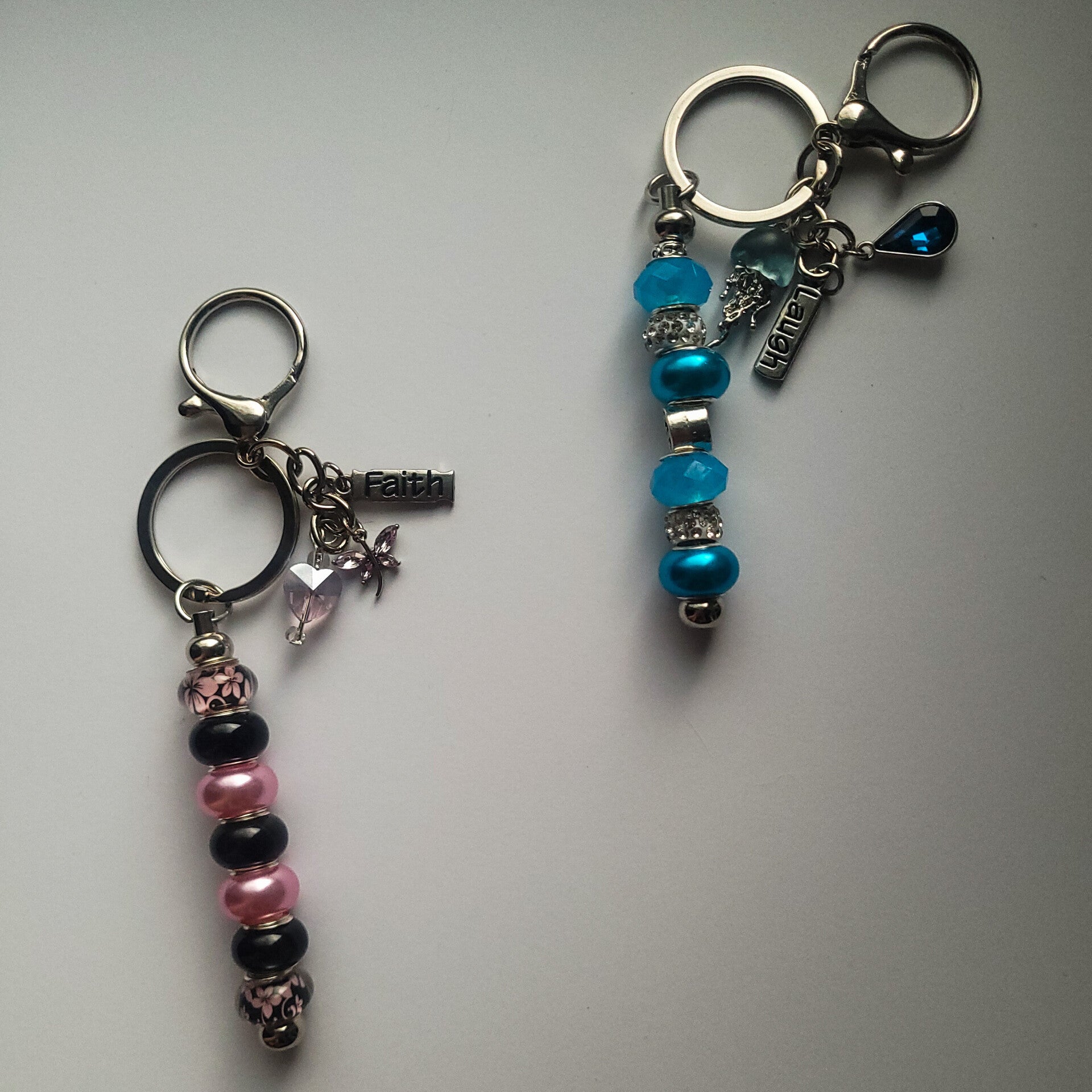Handmade with care, the Faith & Laughter Keychain Collection features beautifully beaded designs in soft pinks and calming blues, each finished with delicate charms like butterflies and meaningful “Faith” and "Laugh" tags. These keychains are perfect for adding a personal, stylish touch to your keys, bags, or backpacks. Lightweight yet eye-catching, each piece is unique and makes a thoughtful gift for friends, family, or yourself. Available in limited quantities at local markets.